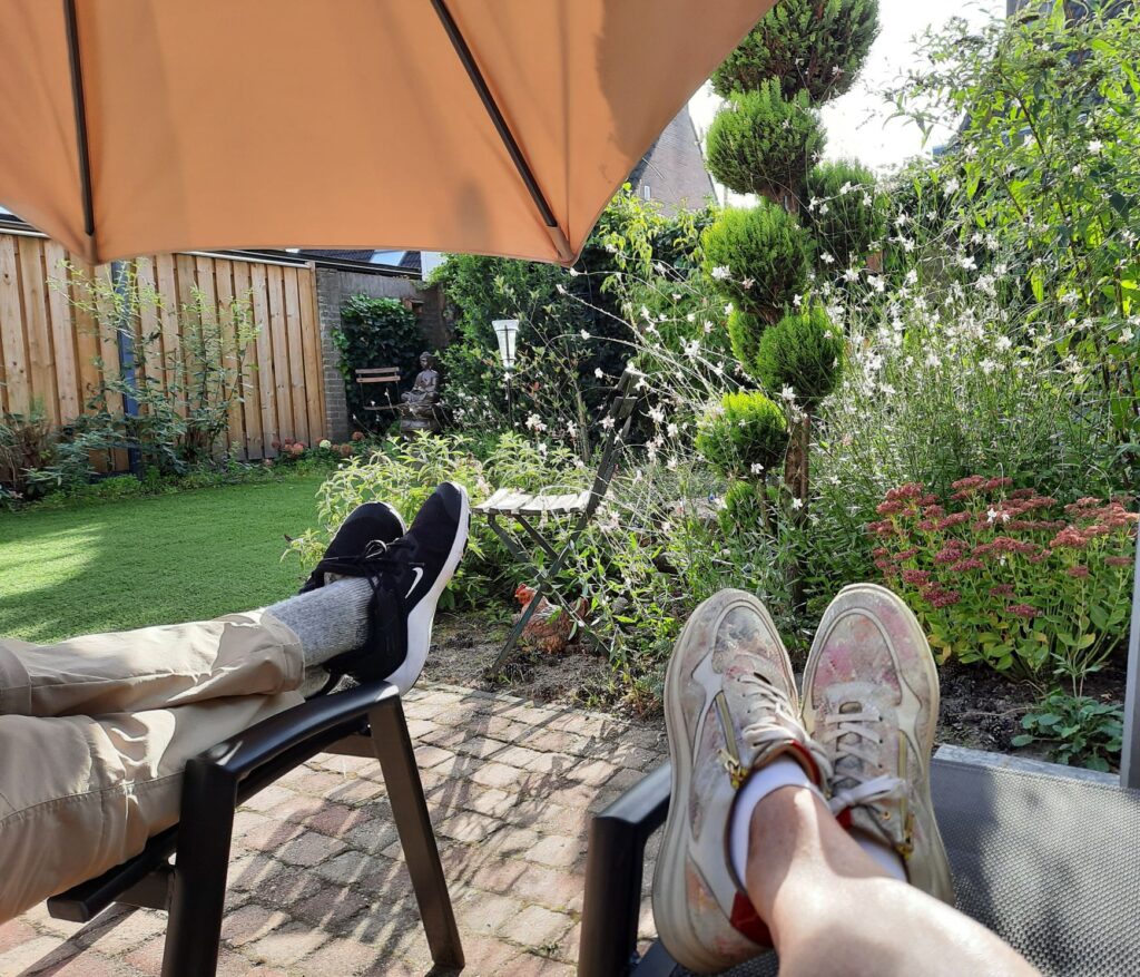 1 oktober 2023. Vandaag zo’n 25 graden. Vanmorgen 12 km gefietst en 4 km gelopen en na de middag lekker de tuin in. Onder de parasol, die normaal gesproken rond deze tijd al netjes opgeborgen ligt. Nu nog even genoten van die heerlijke nazomer in gezelschap van elkaar, ’n bier en ’n wijntje. Dat is nou écht genieten; daar kan geen terras tegenop.